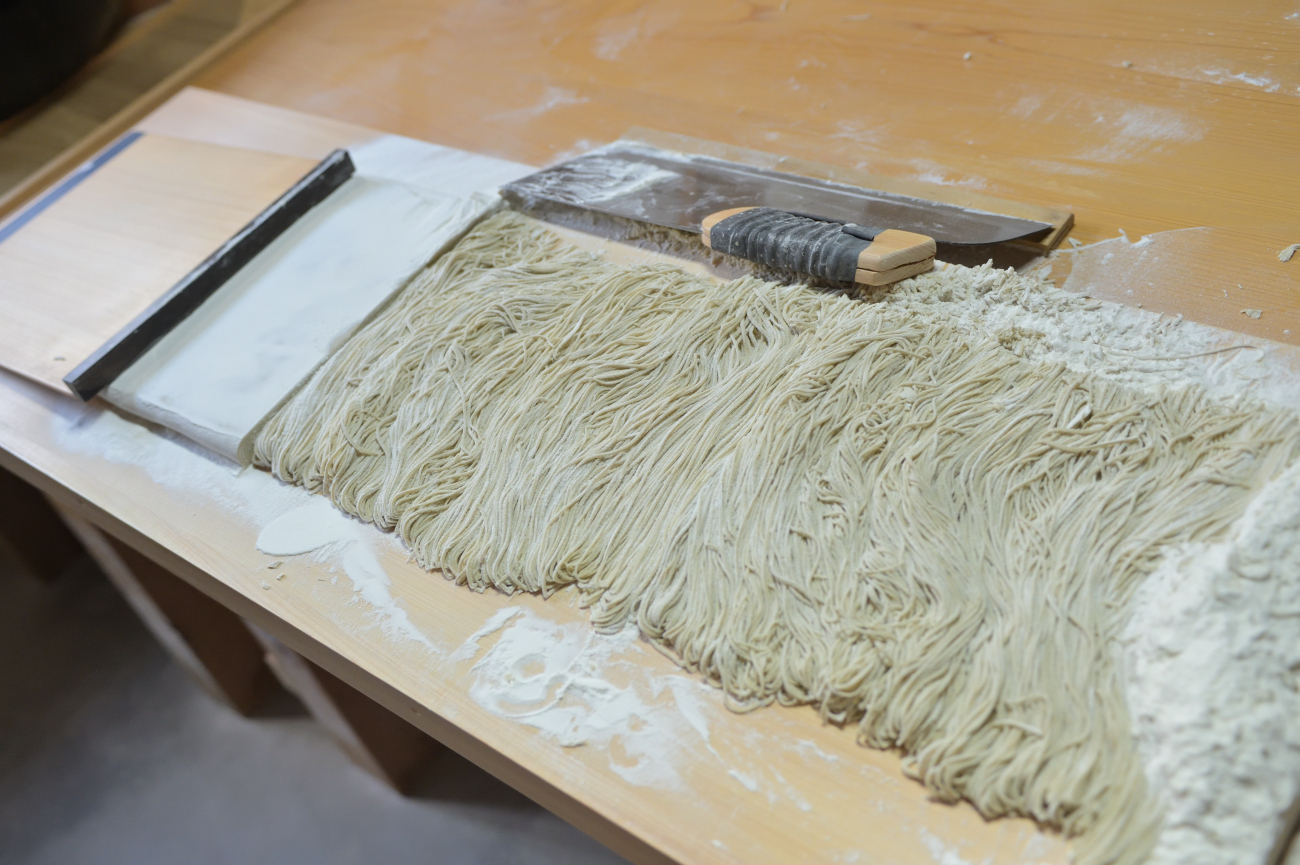 十割を、薄く延し、長く、細く打つ。